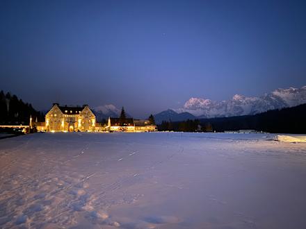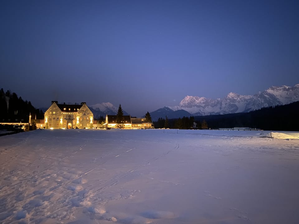 Blick aufs Hotel zur Nacht