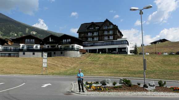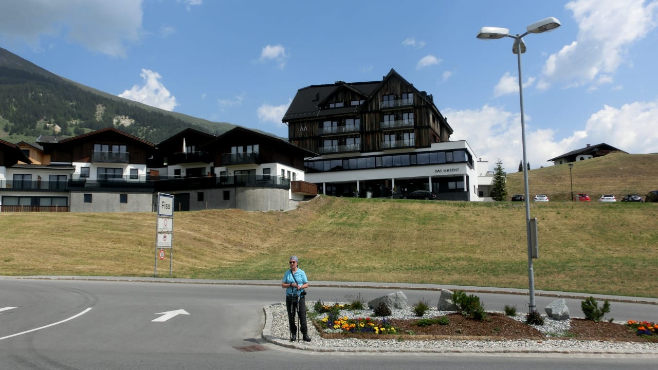 Hotel ( Bildmitte ) oberhalb der wenig befahrenen Dorfstrasse