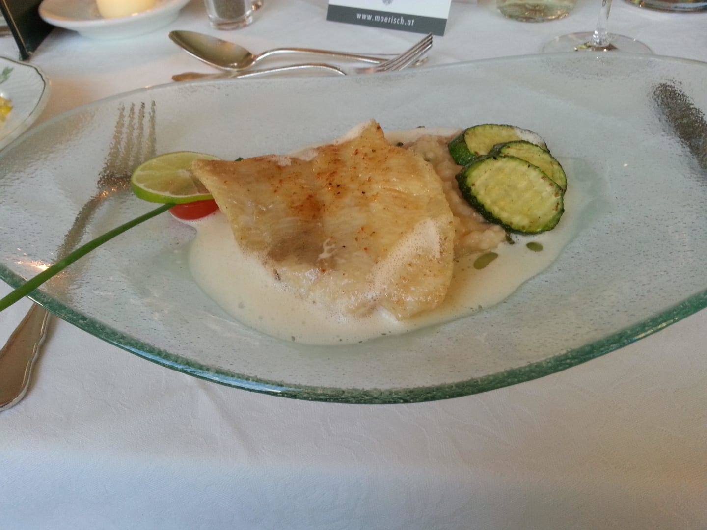 ABENDESSENHerrlich schmeckender Heilbutt in Schaumsaucerl und leckerem Risotto. Davor gabs an dem Tag eine Karotten-Ingwersuppe - vom Feinsten.Vorspeise und Salat vom Büffet. Und für mich als krönenden Abschluss gebackene Apfelradeln. Selten so gut gespeist !