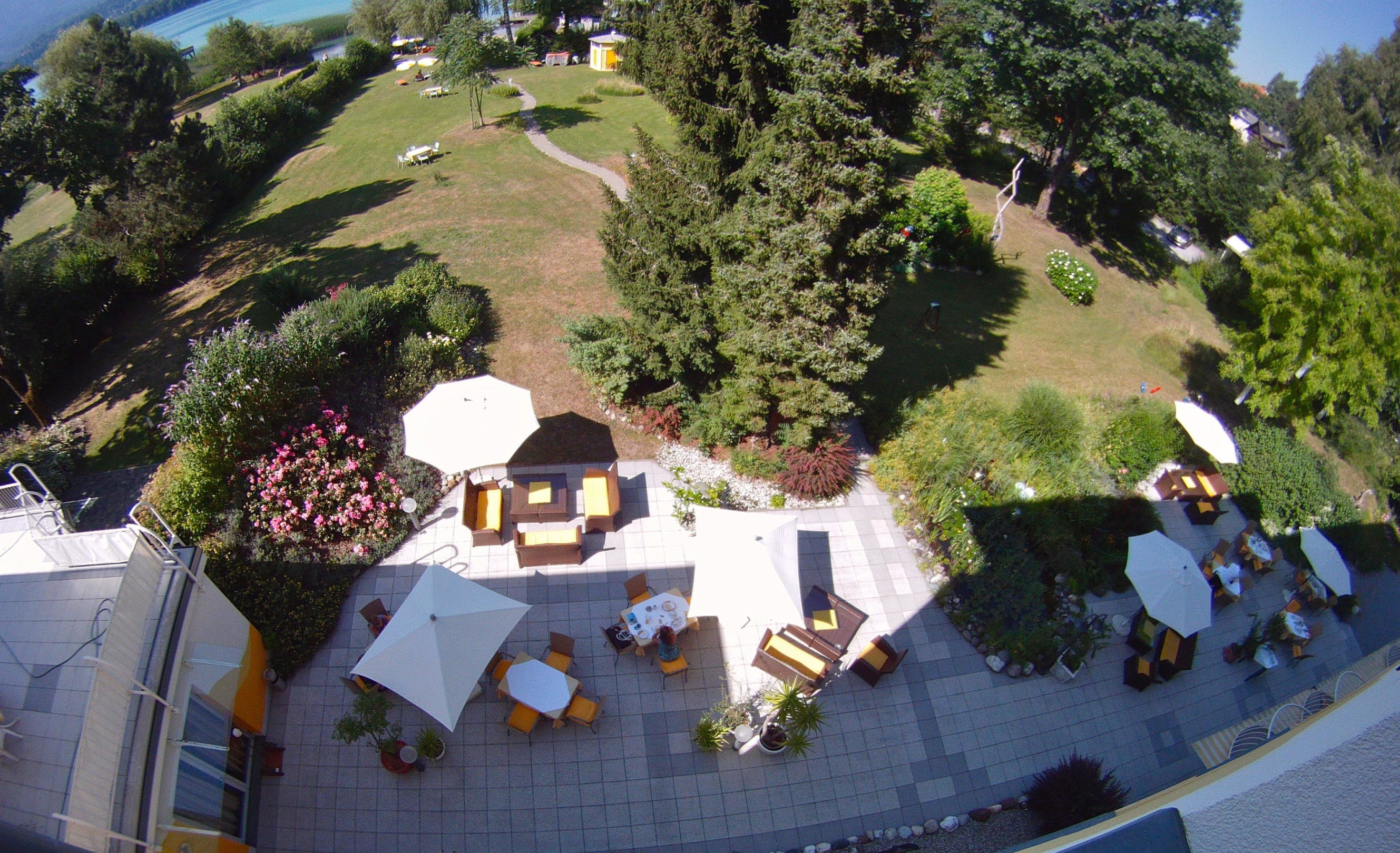 Blick vom Zimmer auf Terrasse und Liegewiese