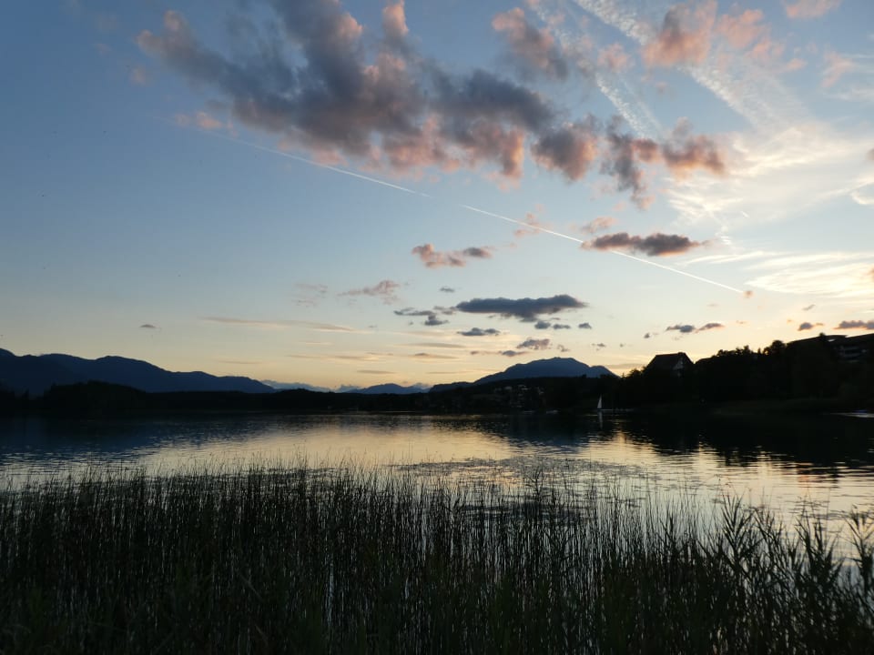 Blick vom Steg auf den abendlichen Faaker See Richtung Dobratsch