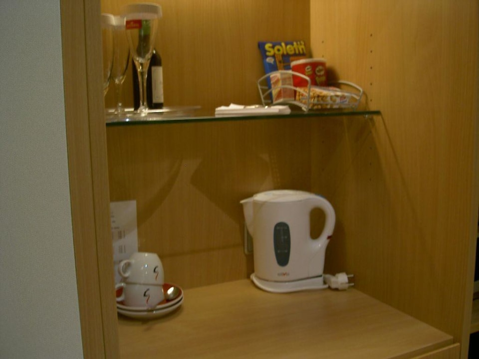 oberhalb der Minibar gab es die Möglichkeit, Tee selber zuzubereiten (Wasserkocher), Sekt- und Weingläser, kleine Flasche Rotwein, Knabbergebäck...