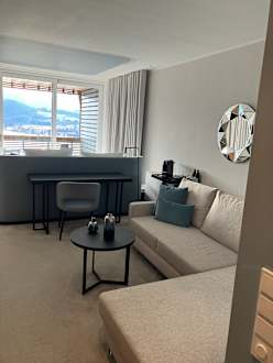 Zimmer mit Seeblick und Balkon.