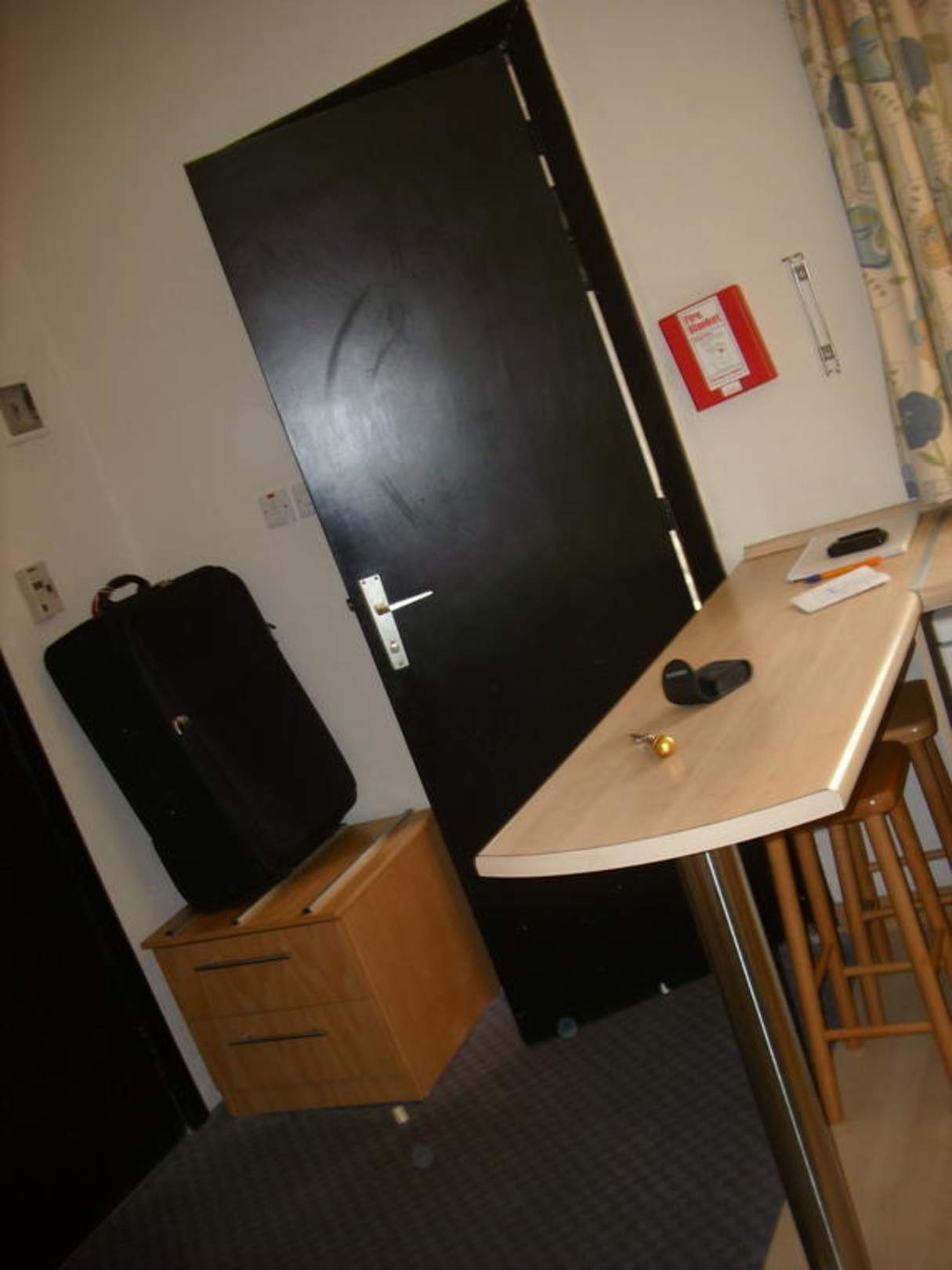 Bartisch, Kofferablage und Blick auf die Badtür
