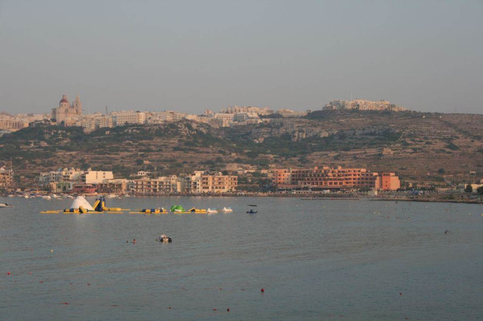Mellieha mit Hotel RIU SeabankOben am Hang: Der Ort Mellieha. Unten: Mellieha Bay mit dem Hotel RIU Seabank rechts.