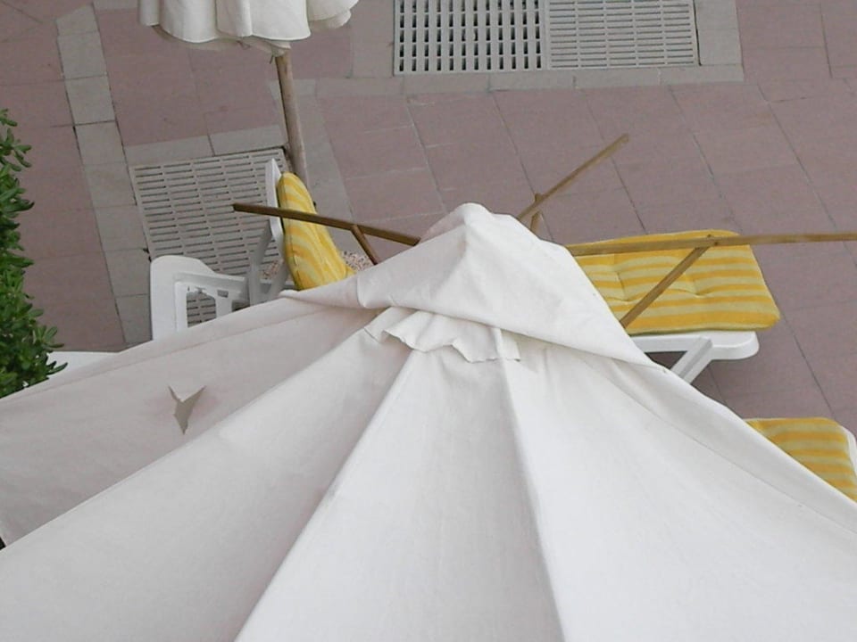 So wie dieser Sonnenschirm sahen nicht alle aus, denn es gab noch schlimmeres. Die Auflagen der Liegen waren so fettig, daß das Eincremen vor dem Sonnenbad nicht notwendig war.