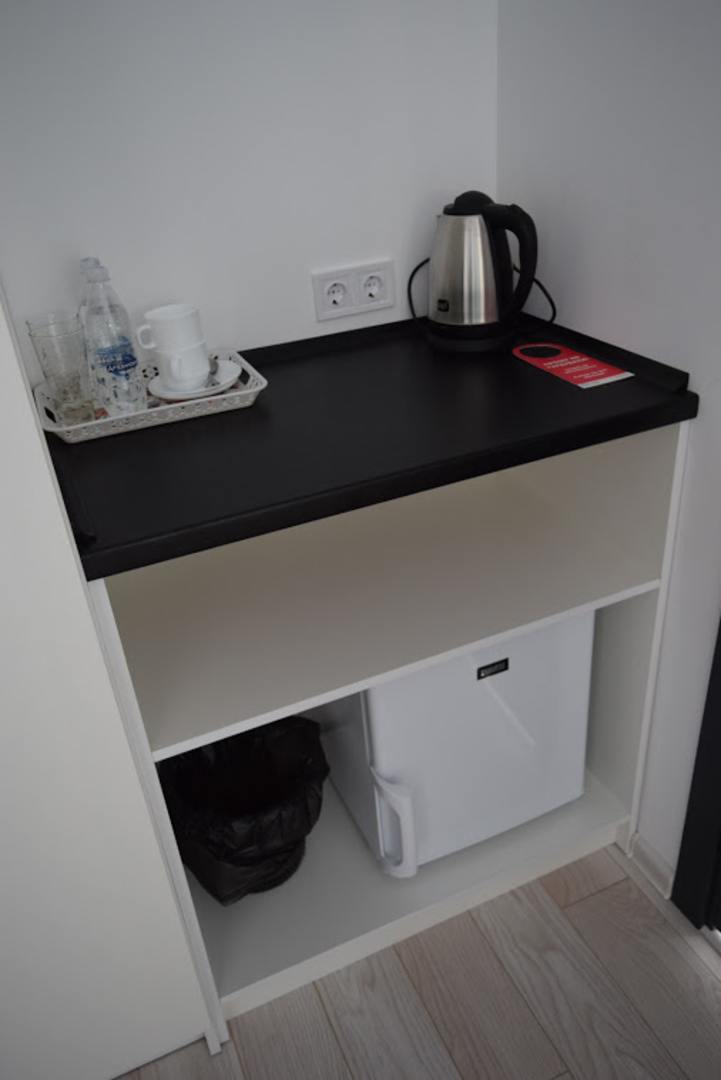 Wasserkocher, Tassen, Gläser. Unten ein Kühlschrank.