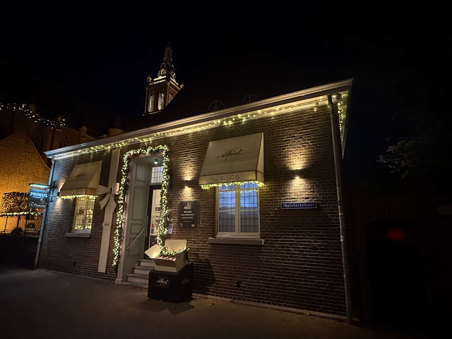 Chocolaterie und Rezeption. Frühstücksraum ist im hinteren Teil des Gebäudes.