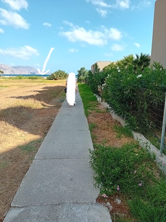 StrandWeg vom Hotel zum Strand, rechts das Eliros Mare, Pfeil zeigt den Abschnitt mit den Liegen des Hotels.