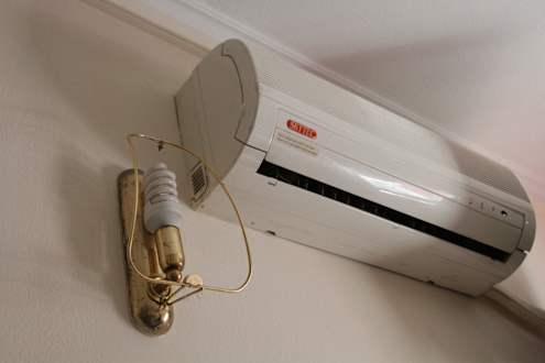 Hier wurde völlig sinnlos eine Lampe angebracht. Wie zu erkennen ist, trug die Lampe einstmals einen Schirm. Der ist anscheinend kaputt gegangen. Ersetzt wurde er nicht und man blickt in die Sparlampe.