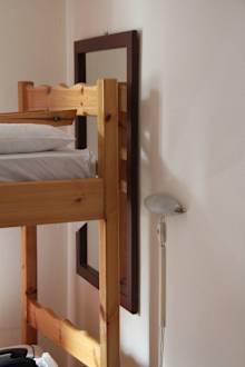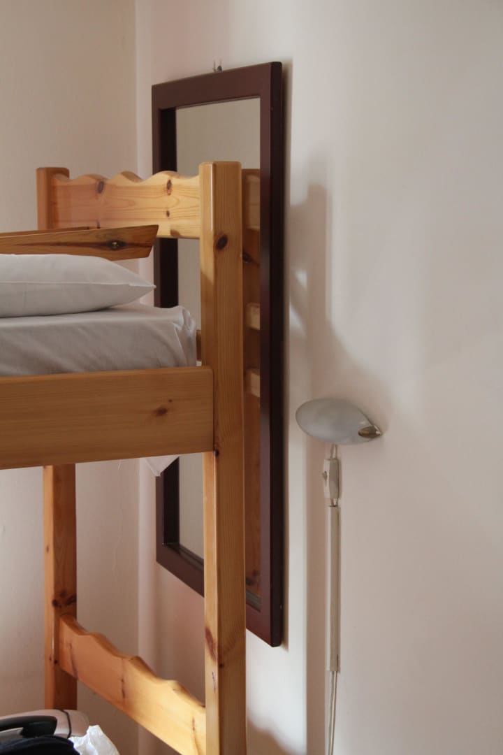 Es ist zu erkennen, dass das Doppelstockbett zusätzlich gestellt wurde. Das Hotelpersonal hat sich noch nicht einmal die Mühe gemacht, den Spiegel, der dort vorher hing, zu entfernen.