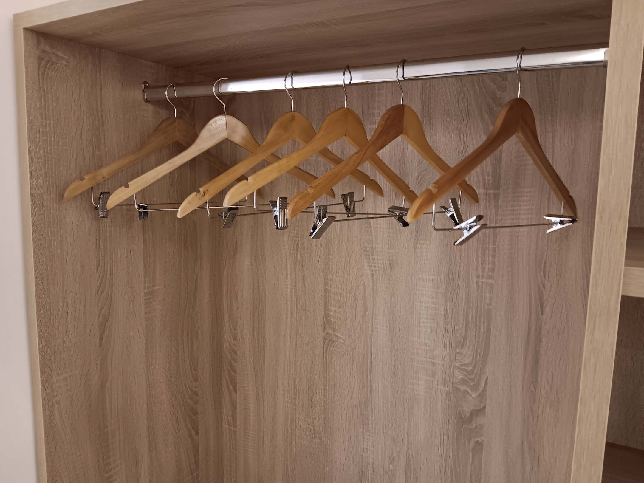 6 Kleiderbügel im Vierbettzimmer; keine Schranktüren vorhanden