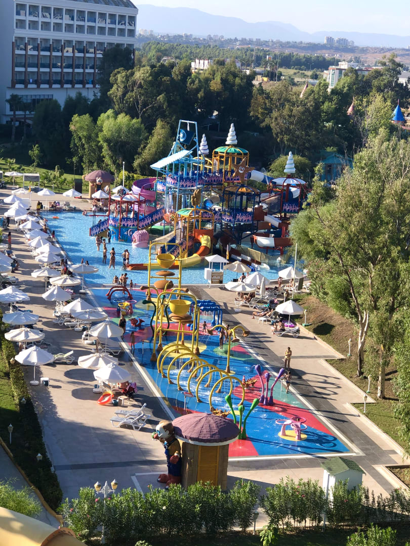 Und hier schlägt das Herz aller Urlauber höher . Vom Rutschen Paradies der Erwachsenen aus fotografiert . Blick auf den Wasserpark für Kleine und Rutschen Paradies der Kids . Ein Traum was Familien hier erleben dürfen !