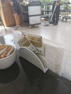 GastroHygiene im gesamten Hotel auf einem Bild passend beschrieben. Penibel genau wird auf Hygiene sowie Maskenpflicht und Mindestabstand geachtet. Hier sogar Servietten einzeln verpackt. Bei Bedarf kann man sich die Hände mit den Desinfektionsmitteltücher