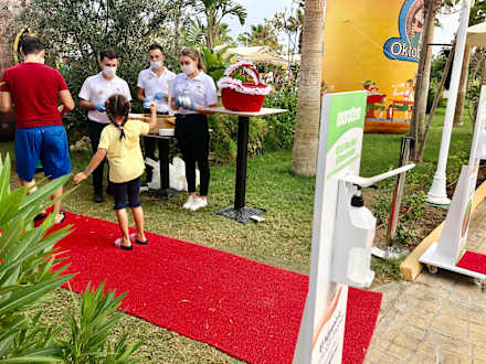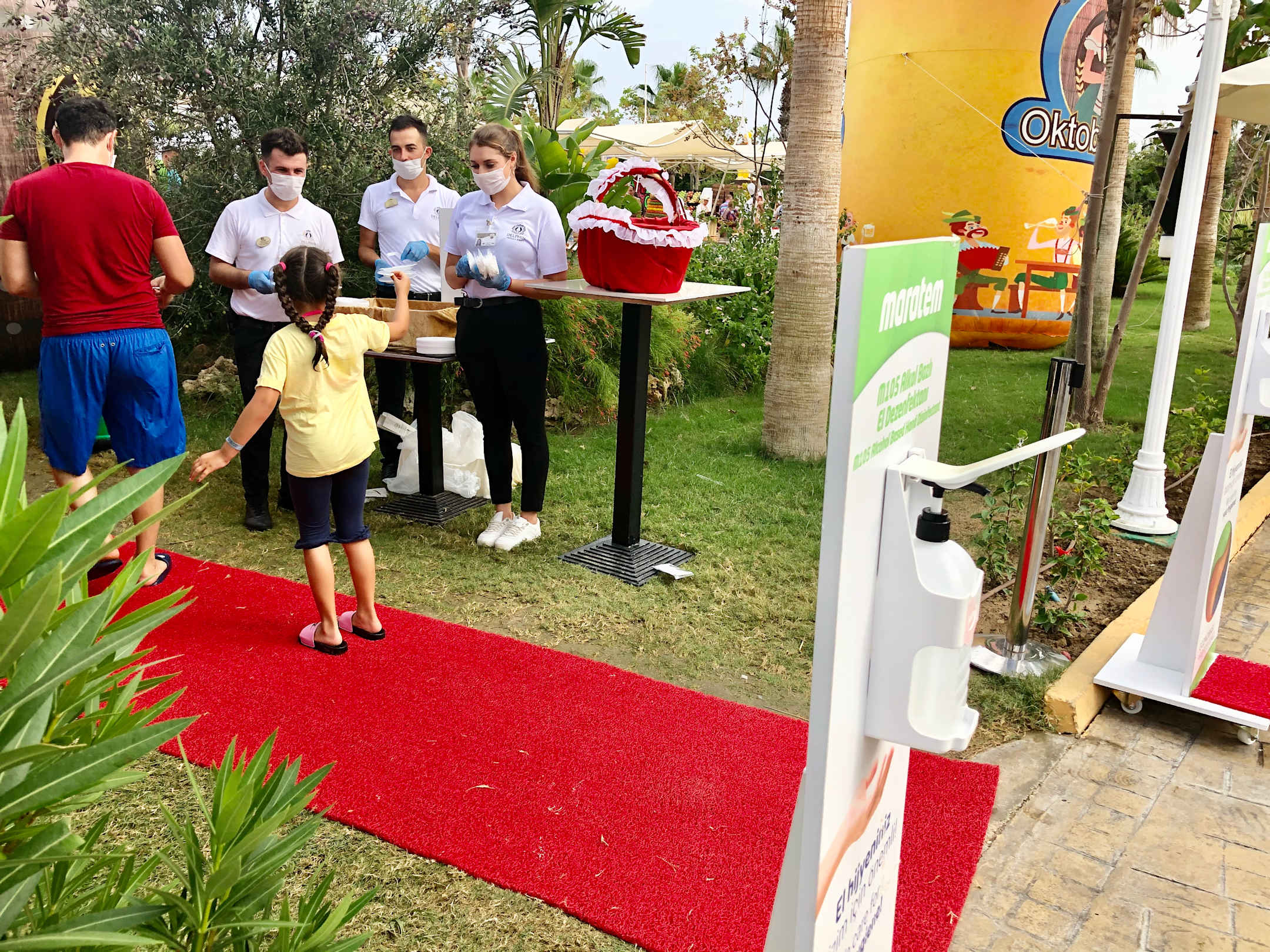 Eingang Oktoberfest ! Desinfektionsspender , Mundschutz und Einweggeschirr .