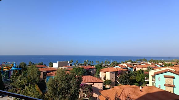 Blick aus dem Fenster über das benachtbarte Hotel, links ein Teil der Rutschenanlage