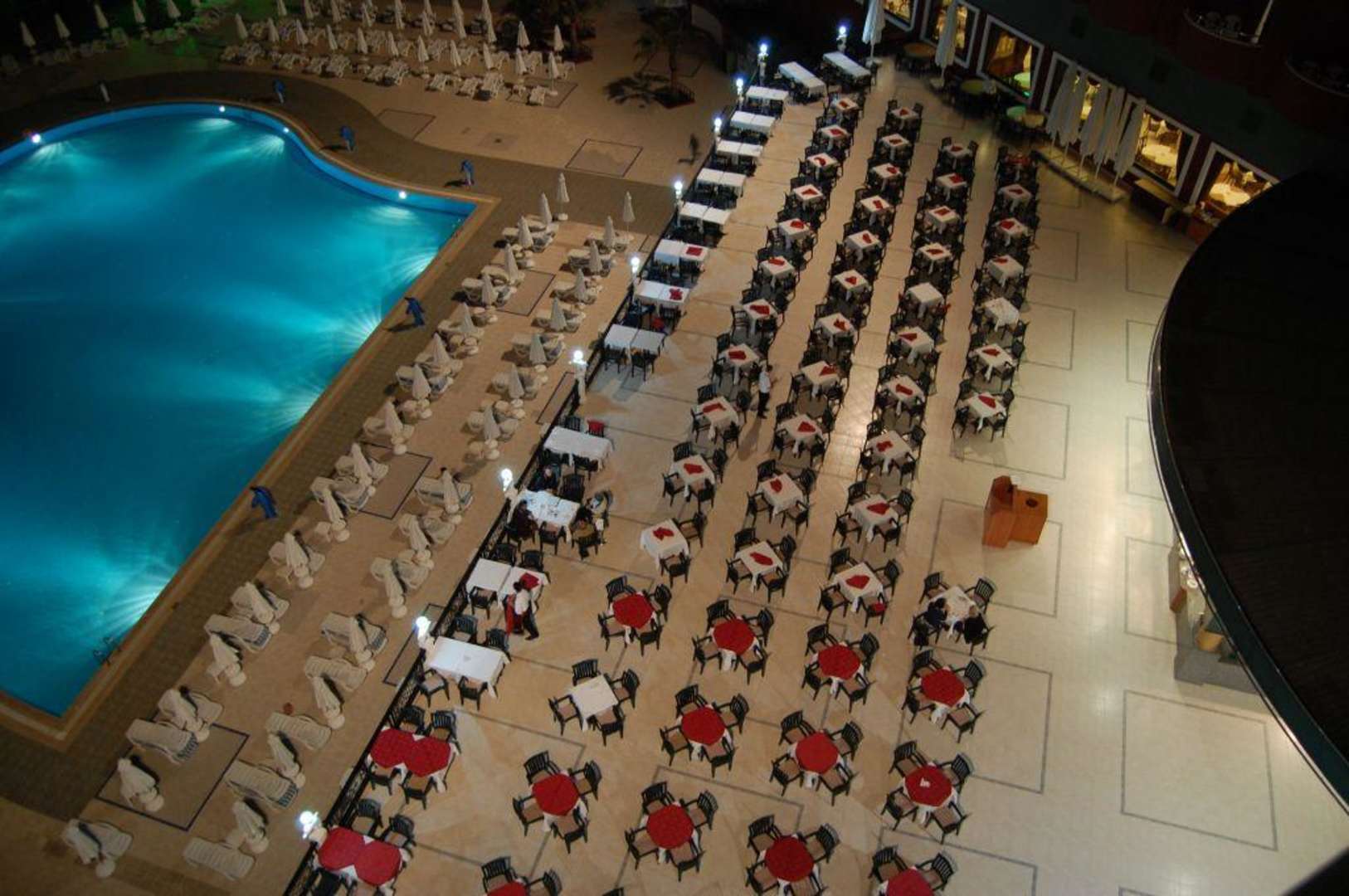 abendlicher Blick auf Terrasse und Pool