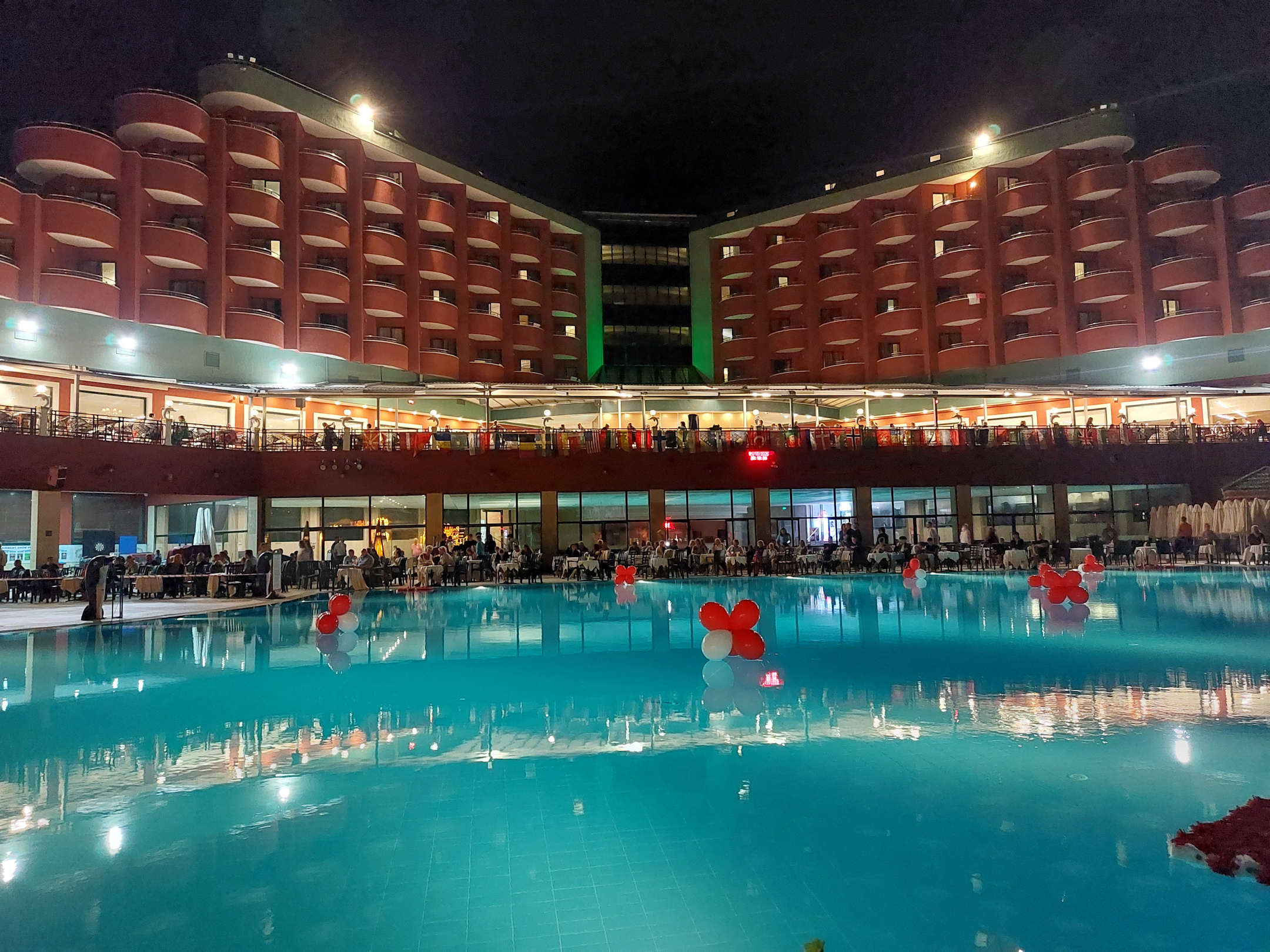 großer Pool mit darüberliegendem Hauptrestaurant (Außenbereich)