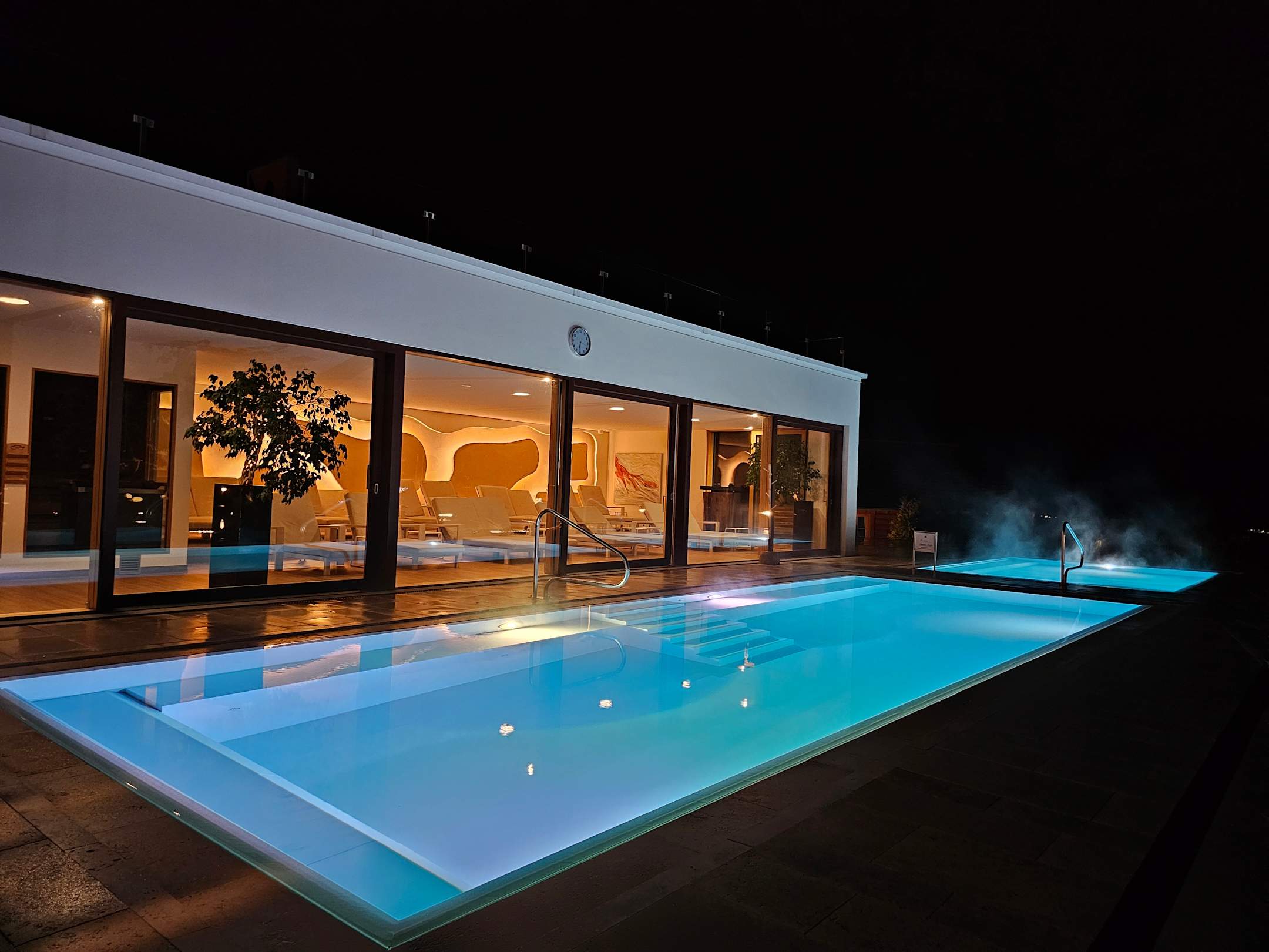 Solepool und Onsenpool, im Hintergrund einer der Ruheräume, links davon die Texilsauna