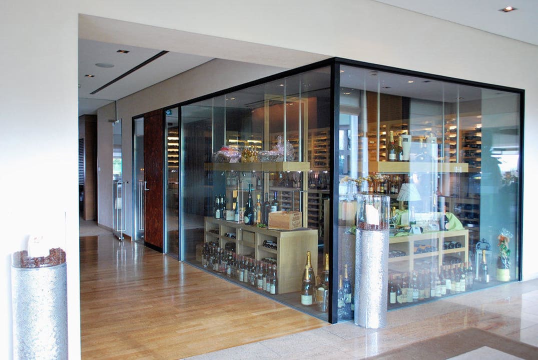 Eigenständige Präsentation der zahlreichen Weine in einem gläsernen Lager auf dem Wege von der Lobby zum Restaurant