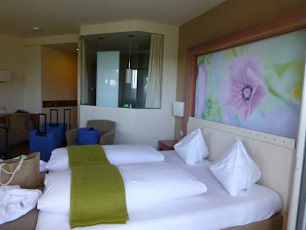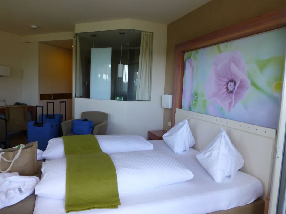 Blick von der Balkontür über das Bett zum verglasten Badezimmer.