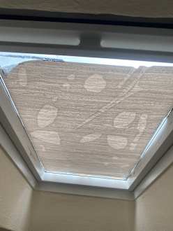 Liebevoll hergestellter Sonnenschutz am Dachfenster im Schlafraum