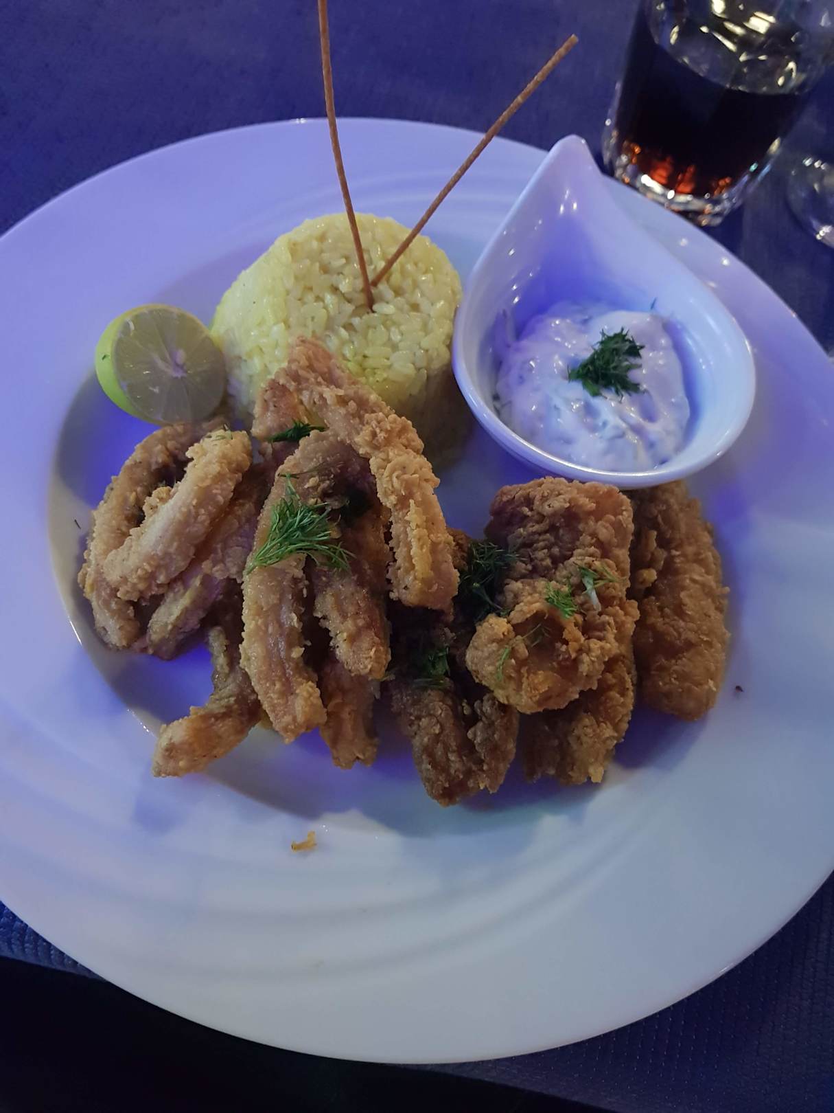 Frittierte Calamari und Backfisch im Fischrestaurant.