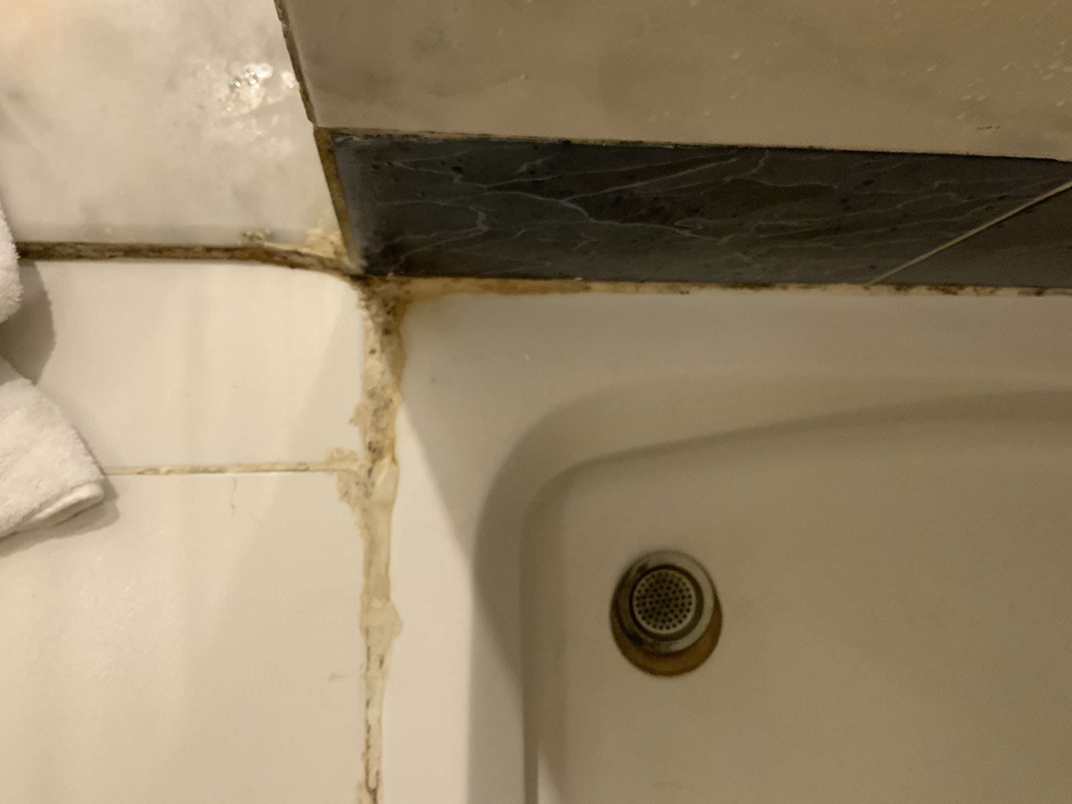Duschwanne mit übermalten, verdreckten und schimmeligen Fugen.