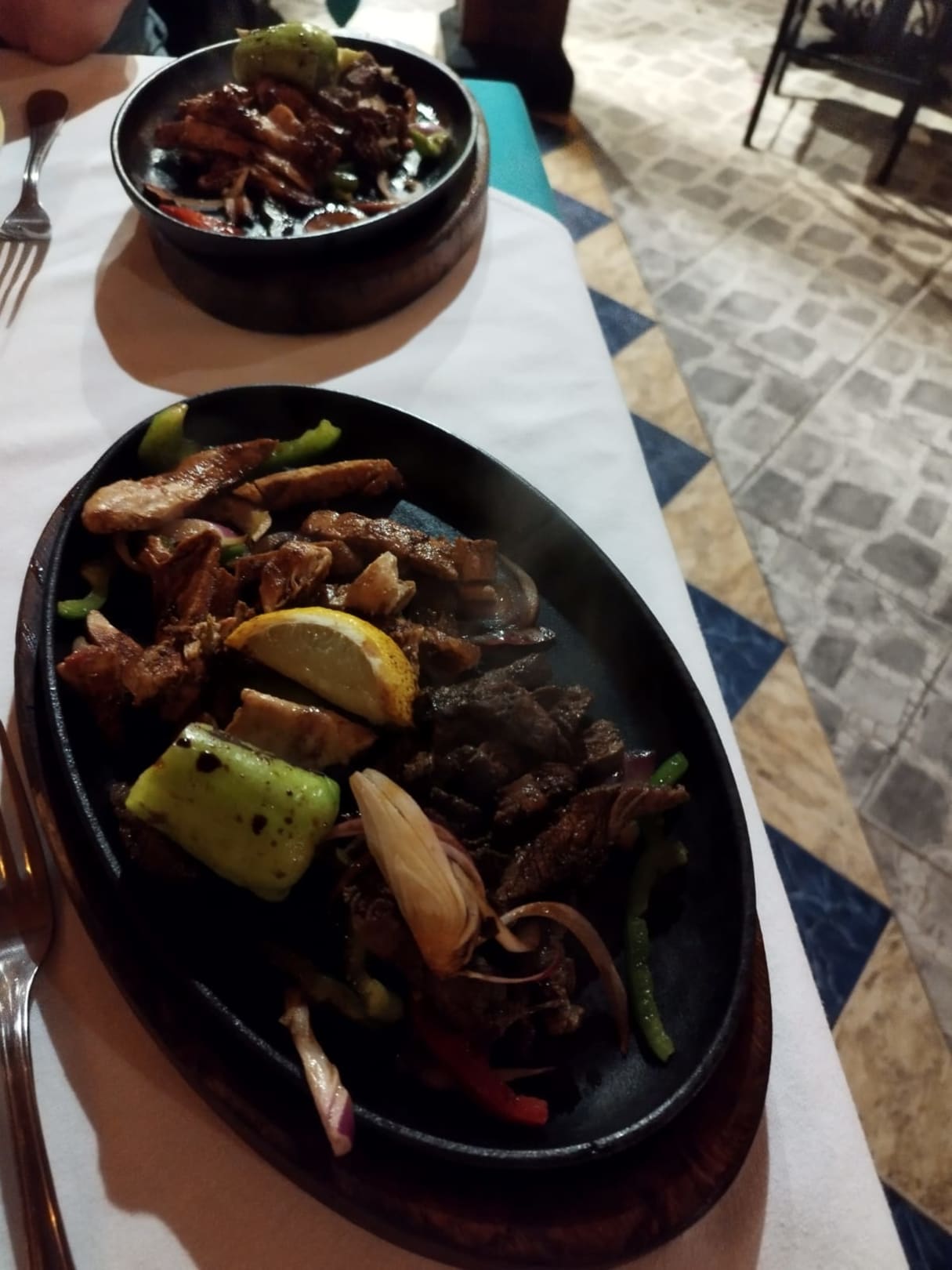 Beim Mexikaner, Hühnchen und Rind in einer Pfanne serviert, gehörte zum Menü ...