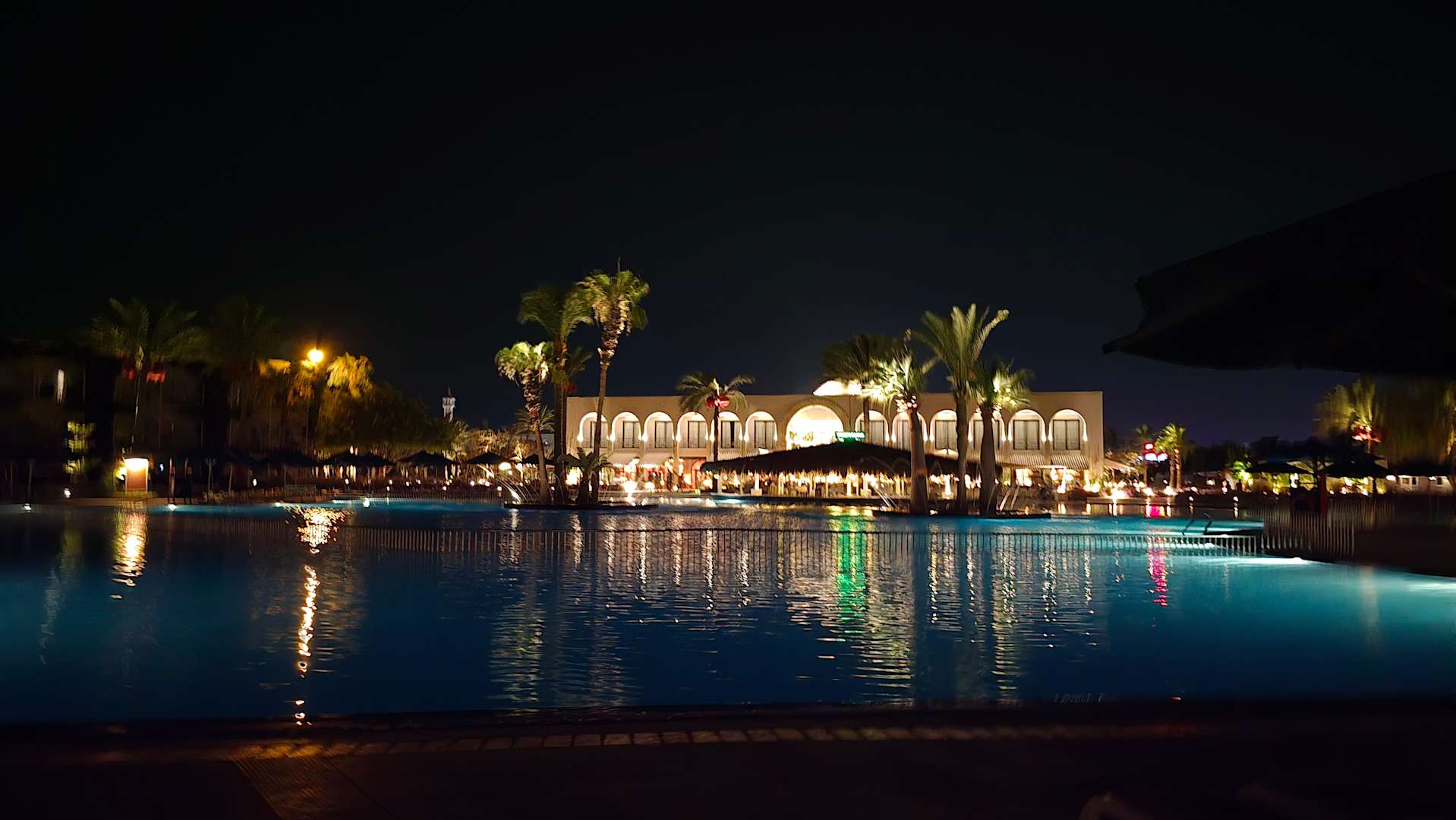 Aussicht über eine der vielen Poolanlagen zur Rezeption / Empfangsbereich