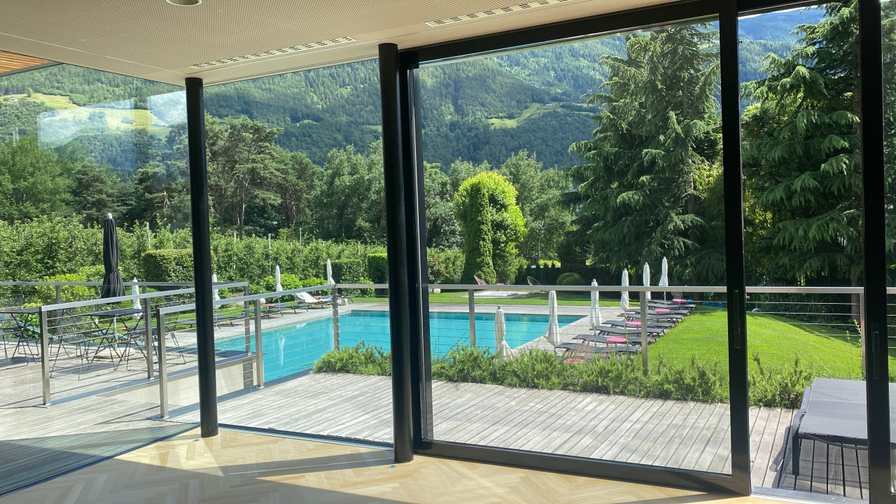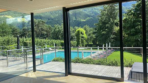 Ausblick aus dem Kursraum in den Garten mit Pool