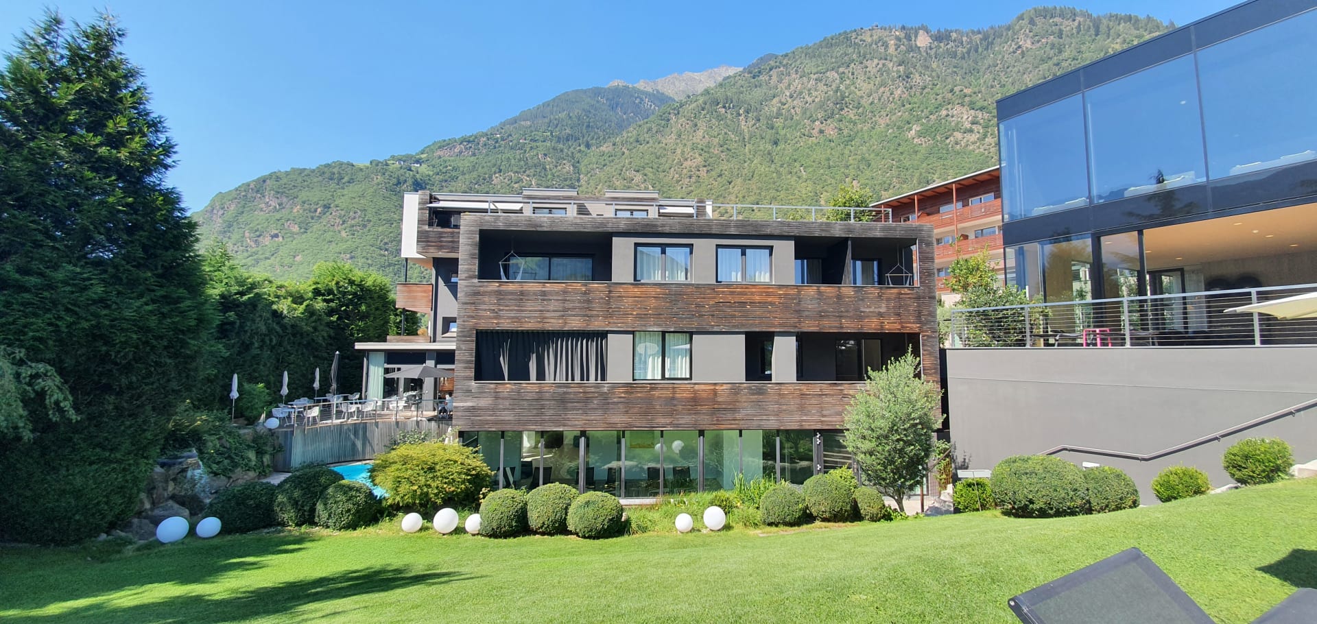 AußenansichtBlick vom Garten/ Pool auf die Rückseite des Hotels. Links ist die Terrasse des Essenssaal zu sehen.