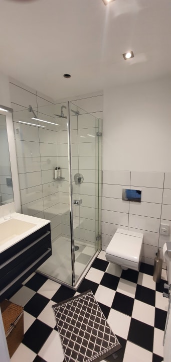 Badezimmer. Hier sieht man, dass die Duschtüre nur bis zur Toilette zu öffnen ist.