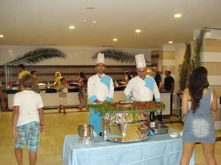Das warme Buffet im Hintergrund mit Köchen