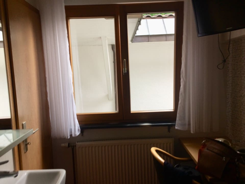 Ein Mini-Zimmer mit Blick auf die nächste Hauswand. Das Bad war so klein, dass das Waschbecken im Zimmer angebracht wurde. Sehr laut, da schräg gegenüber die Kegelbahnen sind. Nie wieder!!!