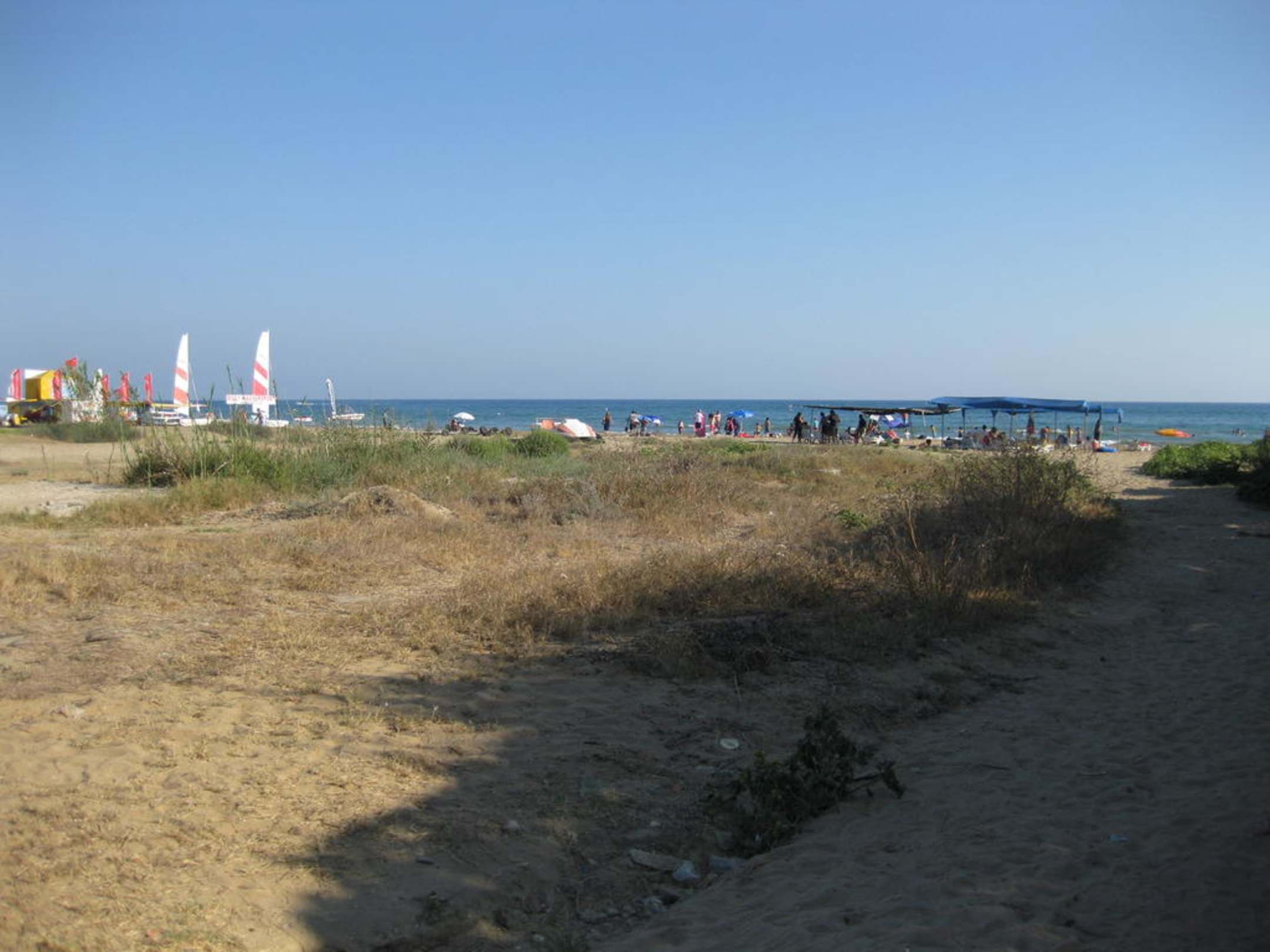 Unser Weg zum Strand - ca. 3 Minuten, ruhiger Strandabschnitt mit wenigen Leuten, Liegestühlen und Sonnendächern, feinsandig und ganz flach abfallend