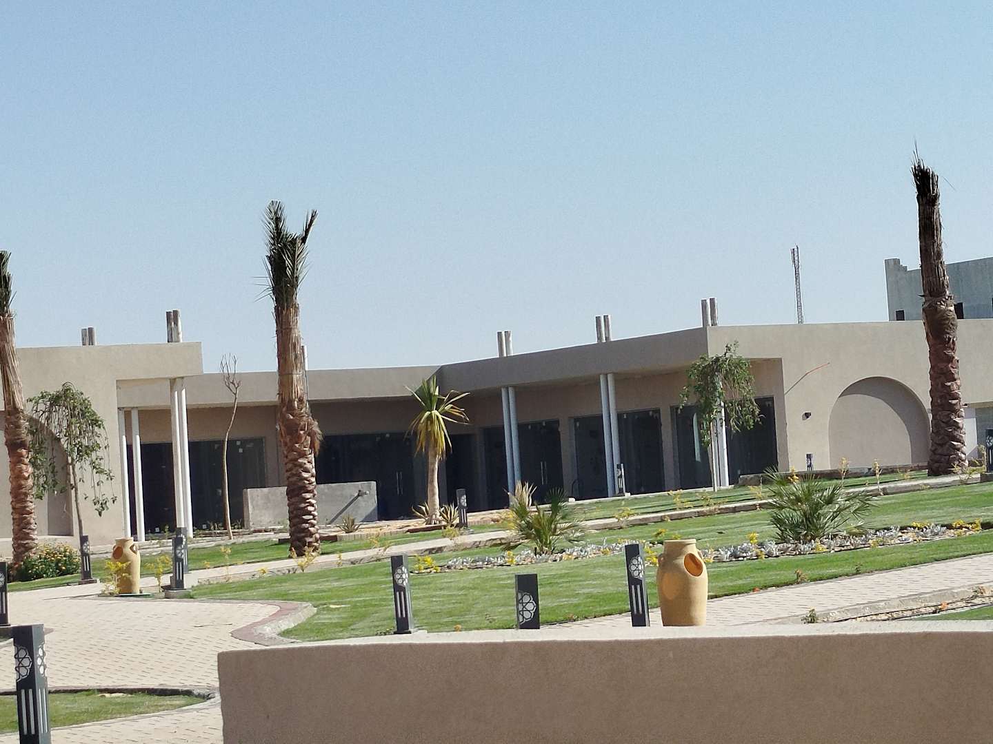 Von der Terrasse auf Gebäude im Bau. Wahrscheinlich Restaurant oder Fitnessstudio.