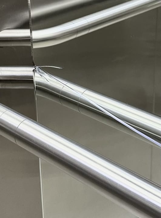 Der Spiegel im Aufzug ist beschädigt.