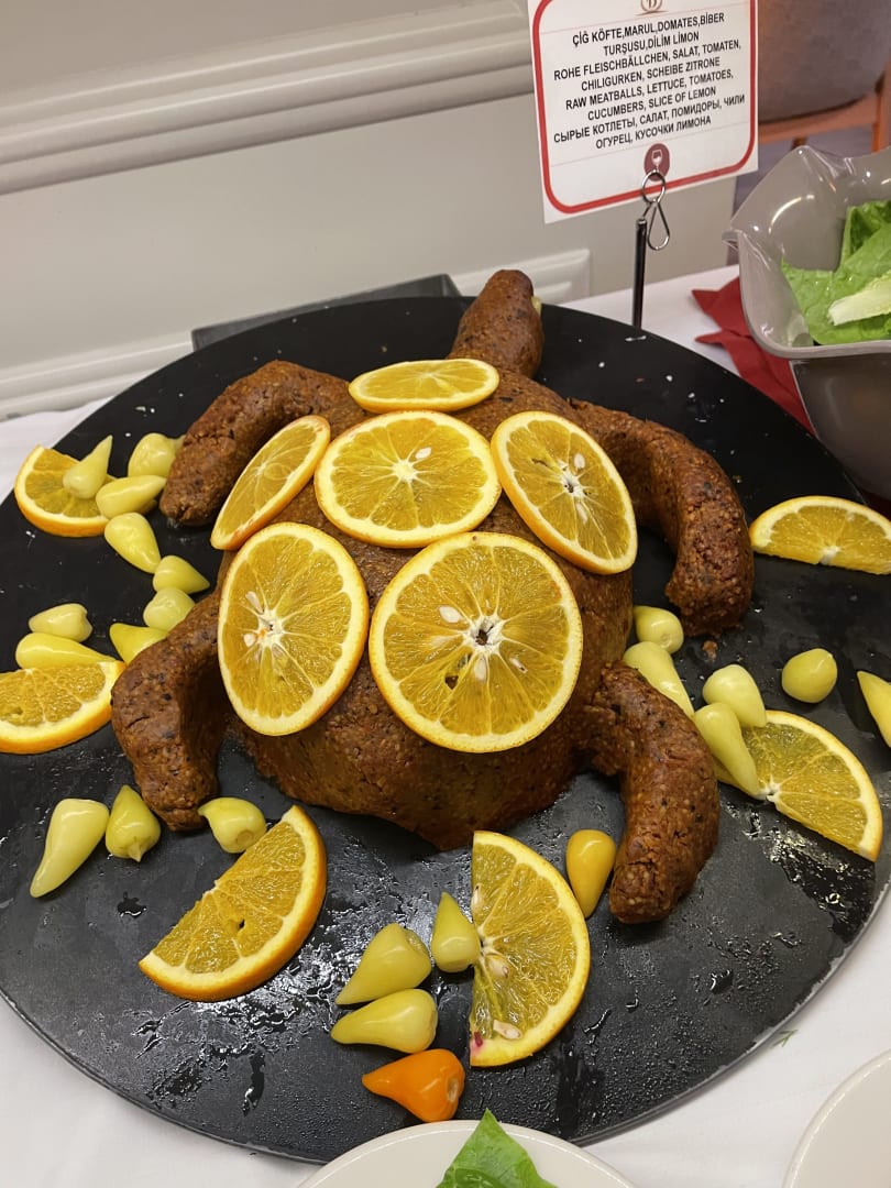 GastroTürkischer Abend. Ich meine das ist köfte. Wird in ein salatblatt gerollt und mit Zitrone beträufelt gegessen.
