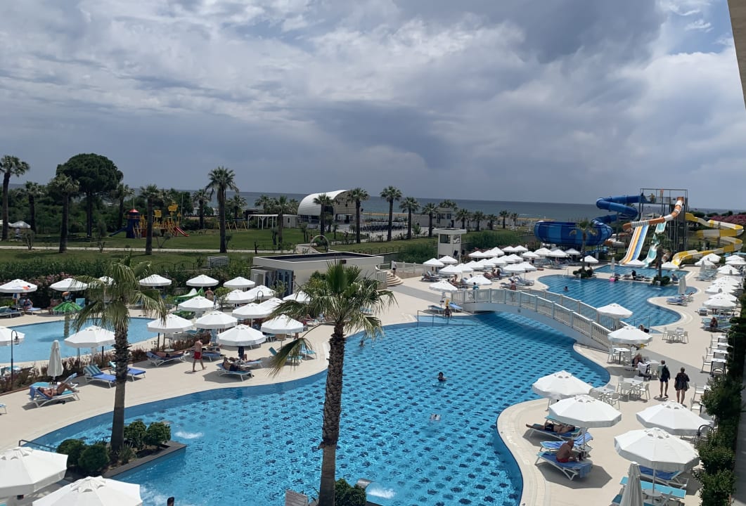 Blick über Pool zum Strand