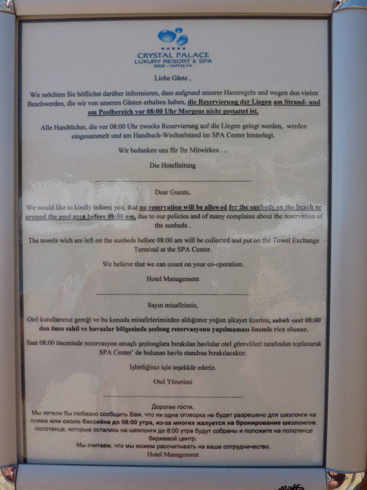 Hinweis auf verbotene Liegenreservierung vor 8.00h
