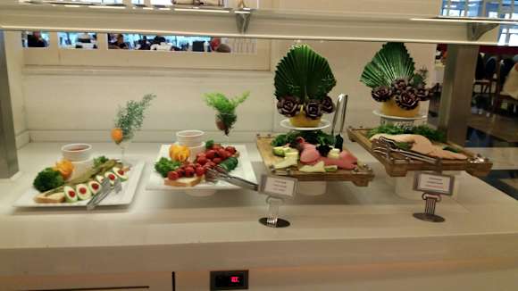 Gastrozum Frühstück sehr viel Wurst-, Käsesorten, Eier, Pancake, Salate, warme Gerichte, Obst, Oliven und vieles mehr