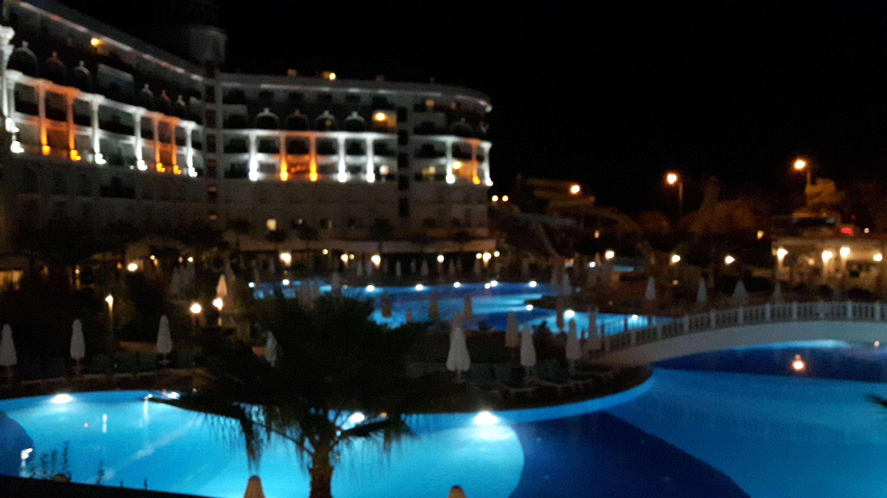 Hotel mit Poollandschaft bei Nacht