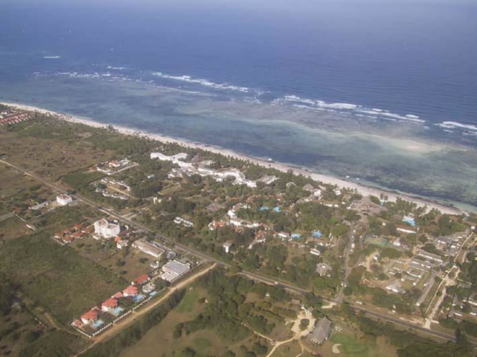 Bei einem Landeanflug zum Ukunda Airstrip das Leisure Lodge Hotel (Bildmitte) und rechts davon der Leisure Lodge Club. Links davon das geschlossene Diani Reef Grand Hotel. Mombasa Südküste, Diani Beach.