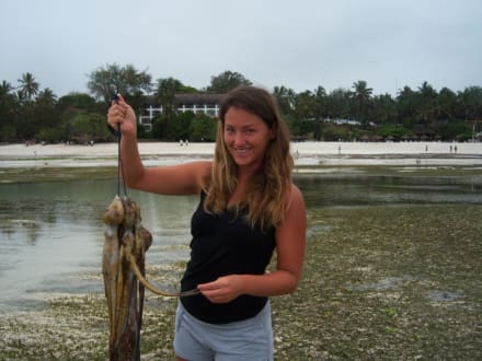 Im Hintergrund die Hotelanlage - Foto fand bei einer Wattwanderung statt, Ebbe und Flut sind sehr stark, teilweise verschwindet das Wasser bis zum Riff und man bis dorthin spazieren (Badeschuhe/festes Schuhwerk vorrausgesetzt)