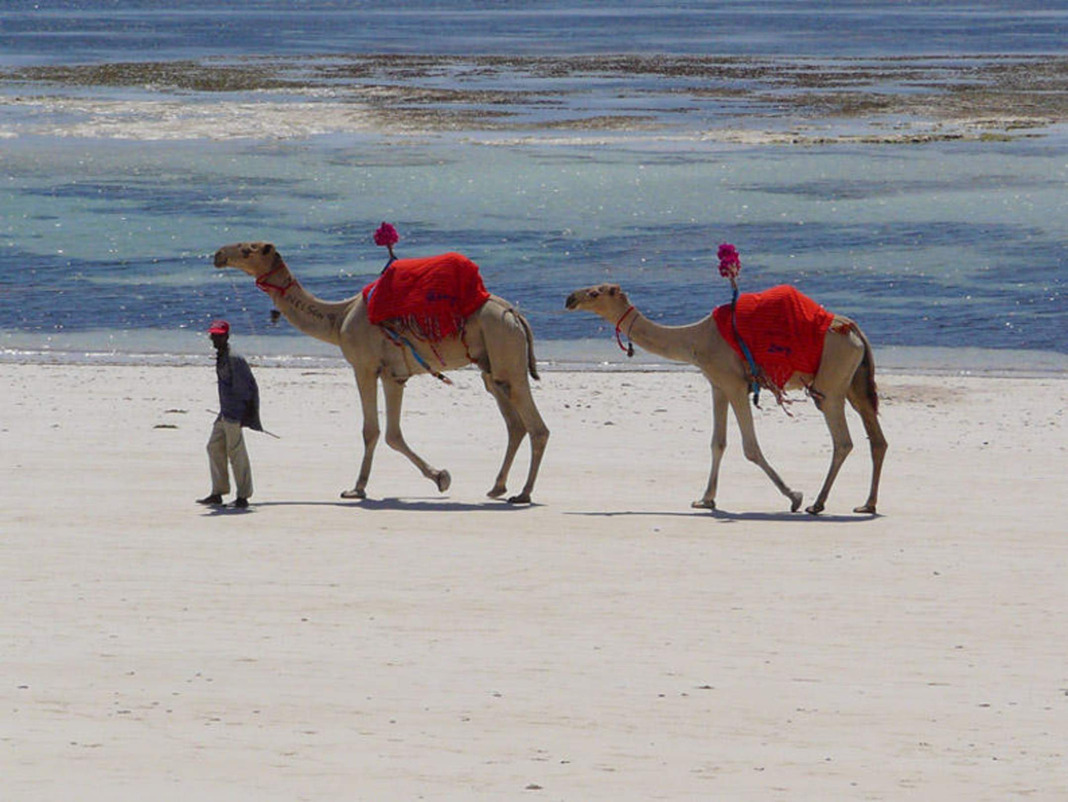 Einfach traumhaft. Kamele am Diani Beach vor dem Leisure Lodge Hotel. Farbspiel mit dem Indischen Ozean im Hintergrund.