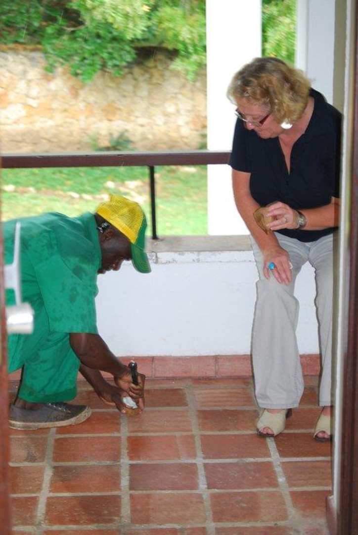 Unser Gärtner öffnet die Kokosnuß für JUTTADer Inhalt schmeckte köstlich und erinnerte mich an Kokosmakronen zu Weihnachten.
