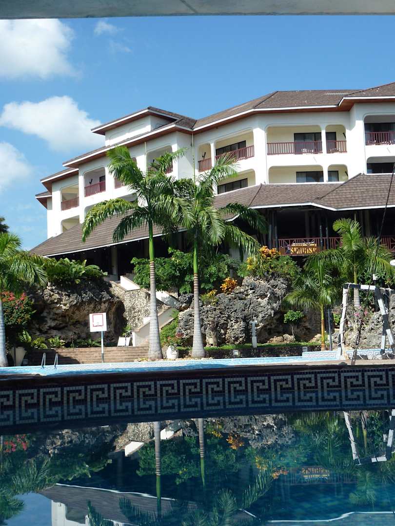 Blick vom Pool auf das Restaurantgebäude
