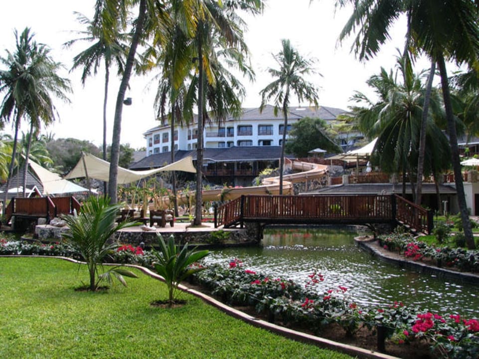 Eine herrlich angelegte Wasserlandschaft durchzieht den Plamengarten vom Diani Reef Beach Resort. Eine Wasserrutsche führt vom oberen Bereich direkt in den Pool. Mombasa, Südküste, Diani Beach, Diani Reef Beach Resort.