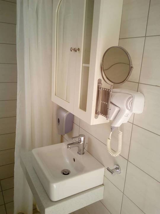 ZimmerNochmals das Bad,mit Vergrößerungsspiegel und Föhn,welcher sehr gut funktionierte.Auch am Waschbecken gab es einen Seifenspender.